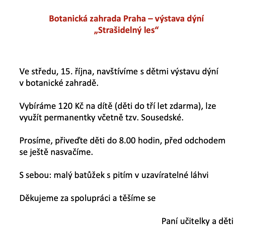 zde přinášíme oznámení o výstavě dýní v Botanické zahradě Praha pro třídy Žabiček a Tygříků.