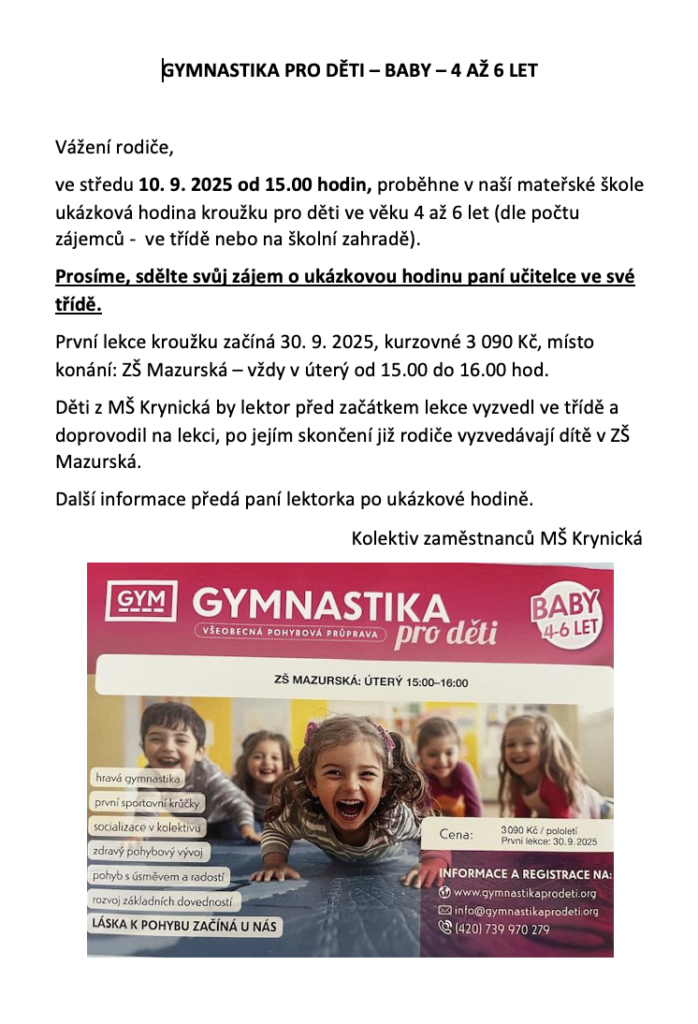 Gymnastika – ukázková hodina 10.9.2025 od 15.00 hod. 7 Zář,2025 Žabičky Vážení rodiče, níže přinášíme informace ohledně nabídky kroužku Gymnastika a ukázkové hodiny. Kolektiv MŠ Krynická