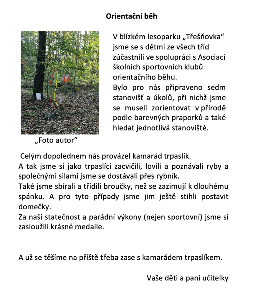 níže si můžete přečíst, jak probíhal letošní orientační běh v lesoparku v blízkosti naší mateřské školy.