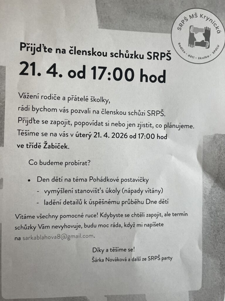 níže přikládáme pozvánku na schůzku SRPŠ, která se koná dne 21. dubna od 17.00 hod. ve třídě Žabiček.