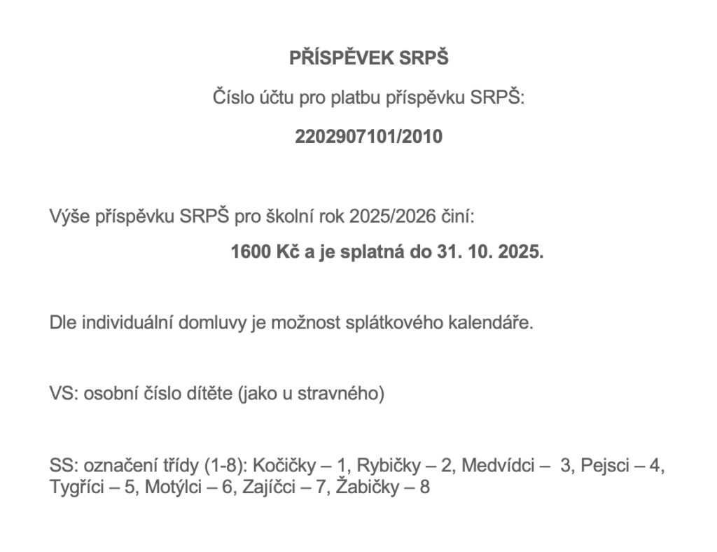 Příspěvek SRPŠ pro školní rok 2025/2026 24 Zář,2025 Žabičky Vážení rodiče, zde uvádíme detaily k příspěvku SRPŠ pro školní rok 2025/2026. Kolektiv MŠ Krynická