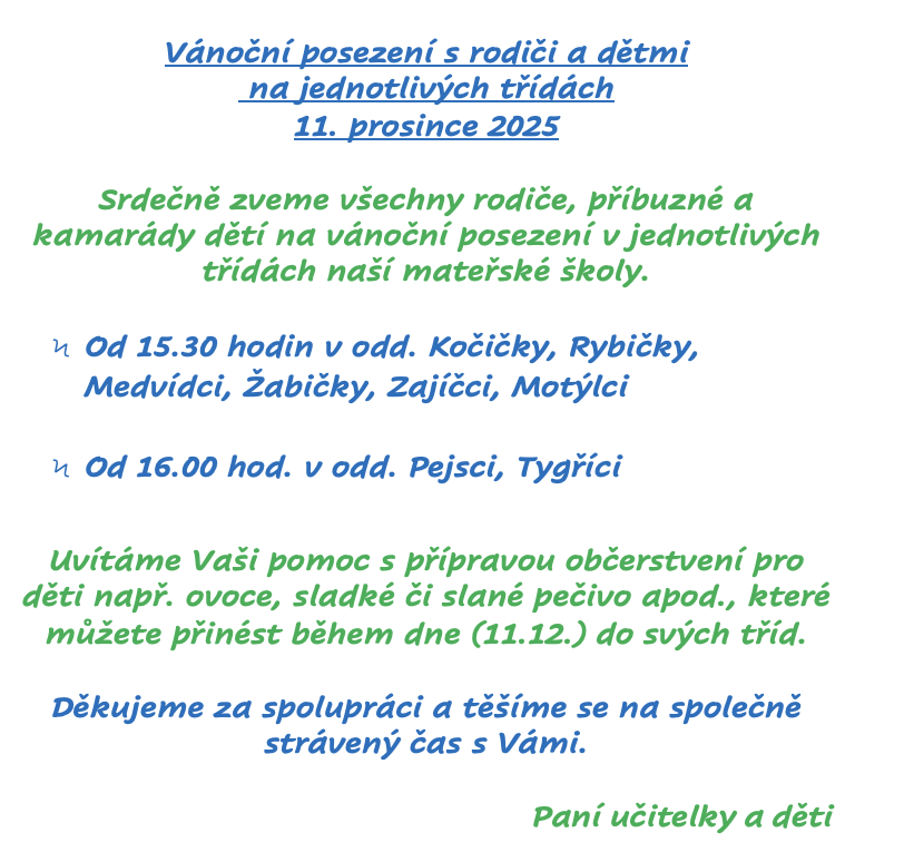 srdečně  zveme na vánoční posezení rodičů, příbuzných a kamarádů v jednotlivých třídách naší mateřské školy.
