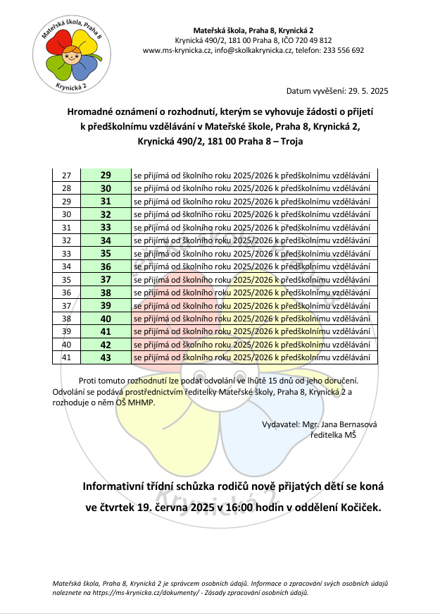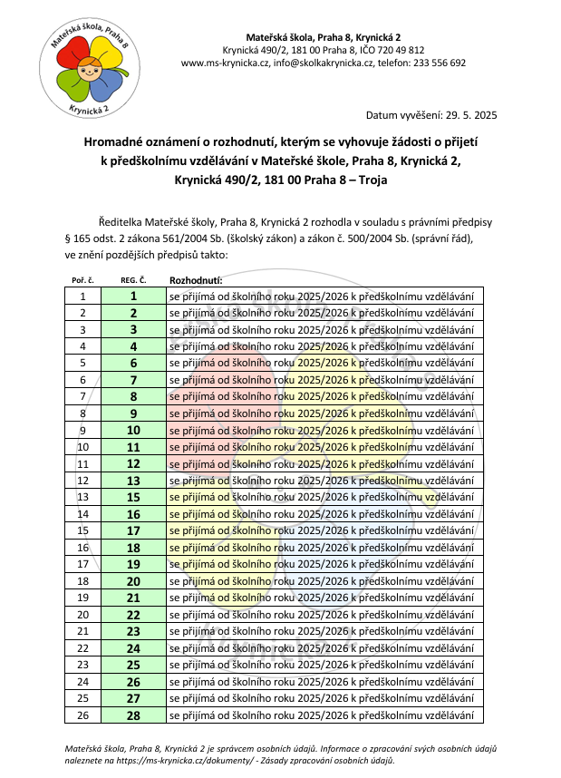 Výsledky zápisu 29 Kvě,2025 Kateřina Rovná Vážení rodiče, níže naleznete výsledky zápisu do naší MŠ od školního roku 2025/2026: